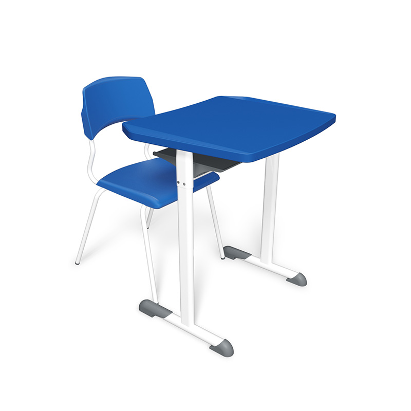 Tampo injetado em termoplástico ABS virgem, com pigmentação, superfície lisa sem brilho e com formato de 2 (dois) ângulos possibilitando a formação de círculos com 6 (seis) ou 30 (trinta) mesas. Possui porta livros em formato retangular, injetado em termoplástico com superfície texturizada.